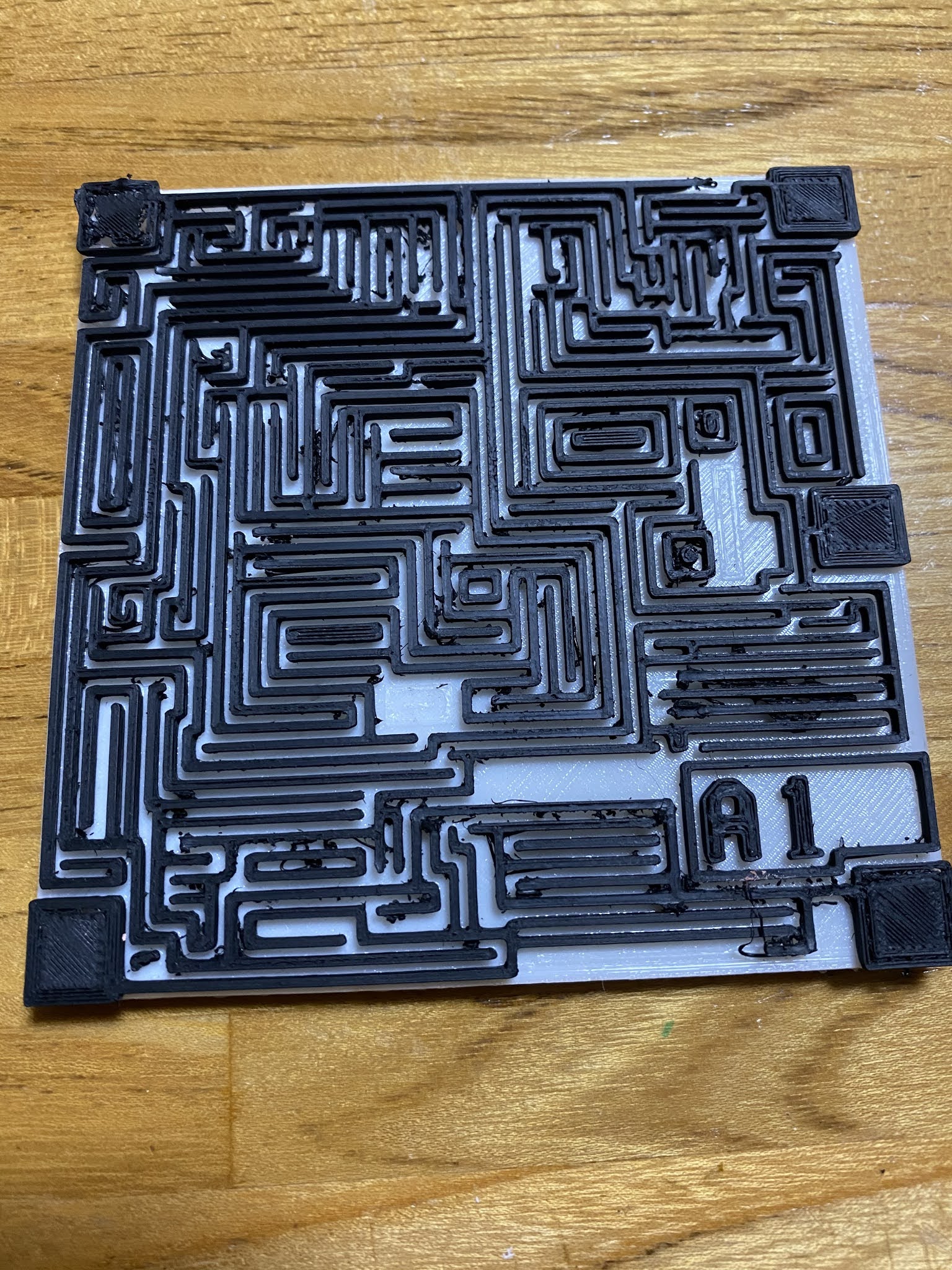 早速ですが、プリント基板のお試し製作で昔よく見た迷路作ってみました。白いPLAで台を作って、手動で途中でフィラメントを交換しています。